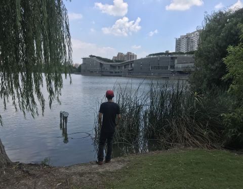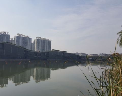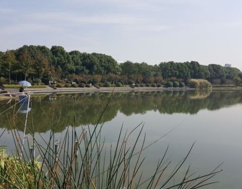 开着导航过来,车子停在电信大楼里的停车场然后走过来。水面很大。有许多人还在湖边捕鱼。 看了介绍,原来这湖还是人工湖。既然人工所为,因势利导,沿着湖边,设着绿道,实是健身好去处。 从博物馆或图书馆出来,气闷时走走,立马神清气爽。青浦新城有了这片水面,一下子就鲜活了。