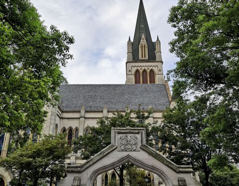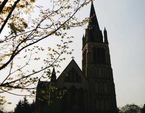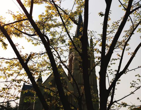 特别漂亮的一座教堂,碧蓝的天空,哥特式风格,尖尖的塔顶非常美丽。教堂就在道路的入口处,非常显眼。教堂门口有个很大的花园,衣冠整齐才能进去教堂。