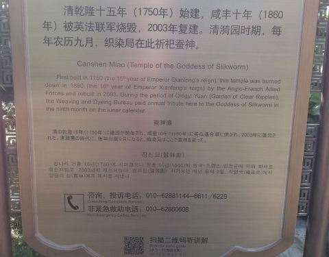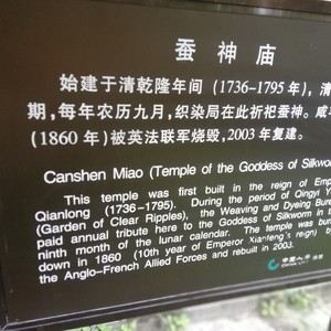 蚕神庙 位于颐和园西北部.建于清乾隆年间(1736-1795),清漪园时,每年农历九月织染局在此庙祭祈蚕神.咸丰十年(1860年)被英法联军烧毁,2003又重建蚕神庙。