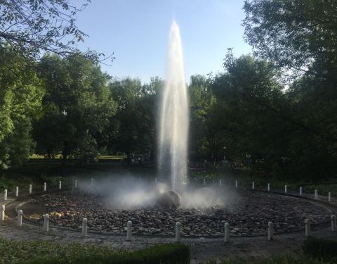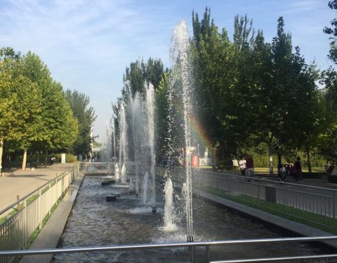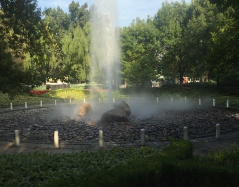雾泉位于朝阳公园西边,是一个喷泉,在阳光明媚的时候,由于雾泉喷出的大多数为雾状,所以很容易就能够看到彩虹,很漂亮。每天喷泉时间是固定的,下午四点之后就基本上不喷了,所以要去一定要注意时间。
