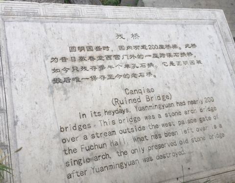 残桥是圆明园之前几百座桥中唯一保存下来的一座,也已经残破不堪了。提醒着参观者圆明园曾有的辉煌,曾遭受过的耻辱,是历史的写照。