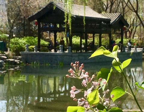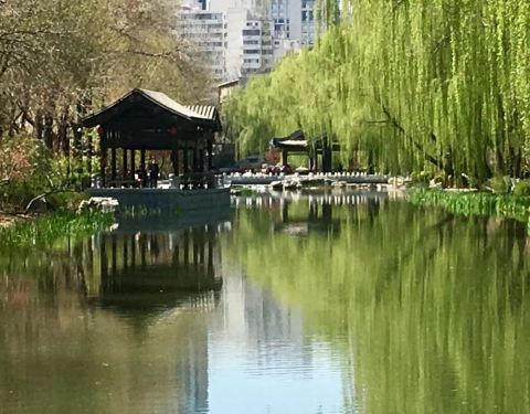 离居住地很近,去家附近的龙潭湖公园,最好的路线就是靠护城河步行,岸边垂柳和李子树榆叶梅桃花等十多种花卉,从春天到秋天花开不断,赏心悦目。远眺中国尊十分壮观。
