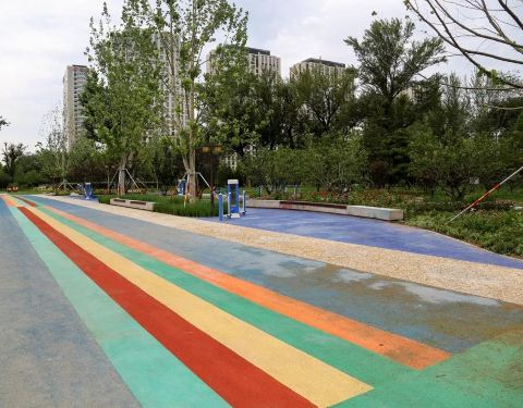 ...所在地,原来是一个化工厂,化工厂搬迁之后,这里成为了一片绿地,特别建设了健身步道和林下健身场地