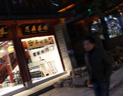 这条街就在木府的旁边,有一个王府街的牌坊,街的一侧是木府大院的高墙,另一侧建有仿古的大檐木屋,很漂亮,可能是客栈,但街上行人很少,比较冷清,似乎街不长,是个死胡同。
