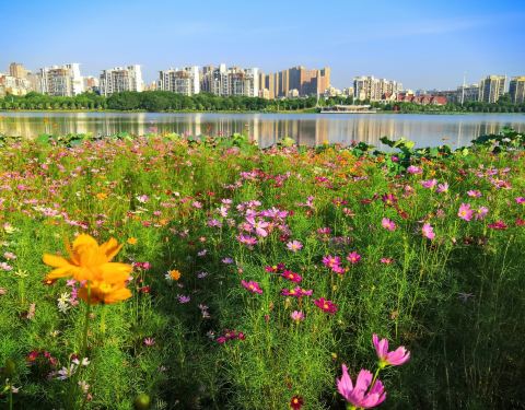 南湖的水非常平静,宛如明镜一般,清晰的映出蔚蓝的天空,远处的高楼倒影在湖面上,像是一幅美丽的画,湖边盛开的小雏菊,黄的,粉的,红的,紫的,在绿叶的衬托下,显得格外娇媚!