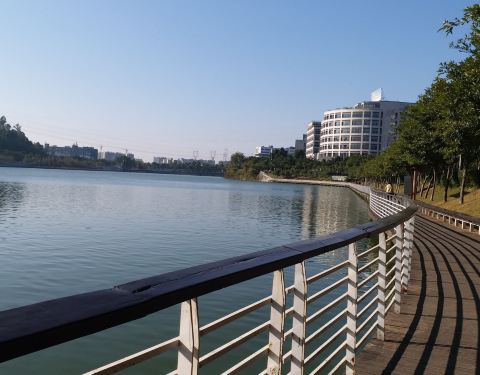 大观湿地公园位于天河区天河智慧园内,市内有公交车直达,没有地铁站,交通还算是方便。 这里早期是一个水库,现在经过改造,成为了湿地公园。公园较大,围绕着湖边。湖边有不少漂亮的建筑。最吸引有人前往这里打卡拍照的地方是岸边的芦苇,开起花来非常漂亮;当然还有那一片红树林,在中午时分,阳光普照,红彤彤的,艳如火。