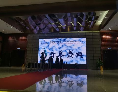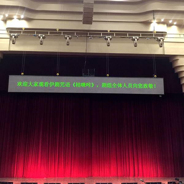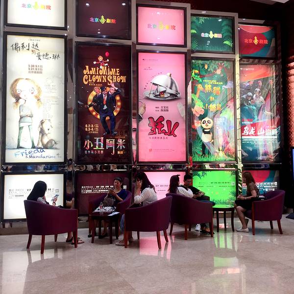 屏幕上播放着今天上映的剧目介绍旁边有休息等候区