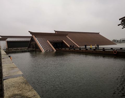 三元宫是广富林遗址公园的一处主要建筑,仿造宋代的建筑风格,又与知也禅寺相连,因此望过去一片飞檐斗角很是壮观。其中三官宝殿是福禄寿三官的祭祀神殿。整个三元宫很清净,听飞檐上角铃被风吹动的铃声,有一种颇为空灵的感觉。另外还可以从殿旁栅栏处拍摄水上宫殿的屋顶。