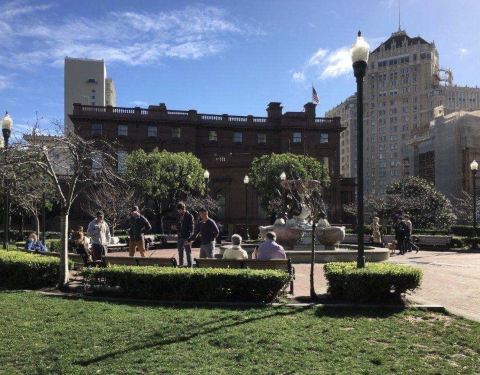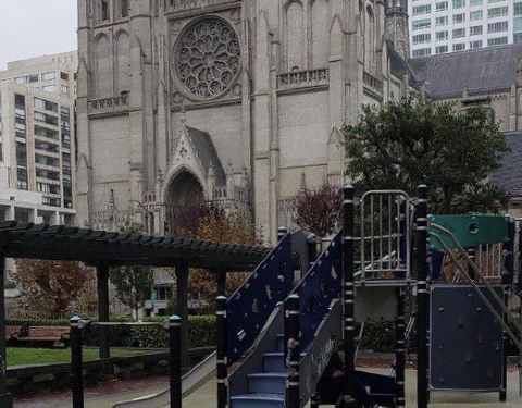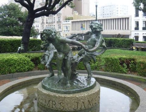 This compact park across the way from Grace Cathedral is one of Nob Hill's treasures. It certainly packs a lot into a city block. Intensely green turf, paved walkways, places to sit, a fountain, artsy statuary,even a playground for the kids. I hate that our guide had to hustle us through the park during a gentle rain. I'd like to have lingered a while to soak in the comforting vibe of the place.
