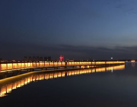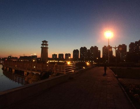 一到早上或者是晚上。在湖上散步的人特别多,在湖的广场上,还有人在那跳健身操。是居民锻炼身体的好去处。