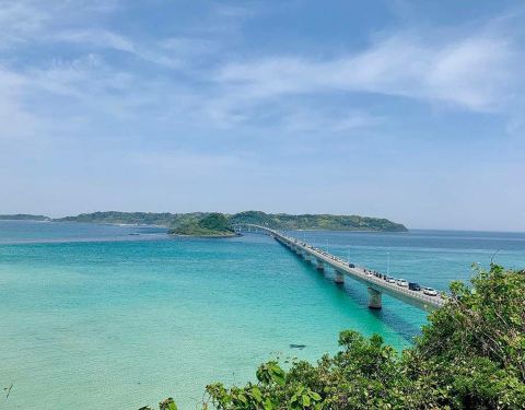 【山口县角岛大桥】离元乃隅稻成神社不远的角岛大桥,唯美的风景像是电影中才会出现的场景,湛蓝的大海延伸至天空的那一端,海天一色的风景让人心旷神怡,甚至被日本的网友票选为「死前绝对要去一次的世界绝景」...