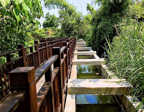 散步起来非常的轻松,绿意林荫夹道清幽的环境,由枕木铺设完成的步道是沿着圳修建而成的,走路时伴随...
