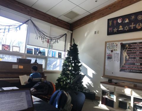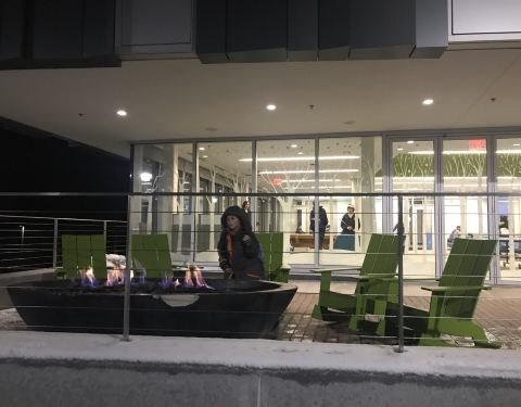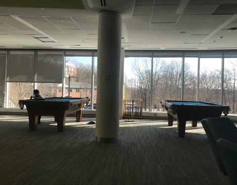 在一小山上,硬件据说在美国也算很不错的。图为图书馆前雪景,学生活动中心台球桌,钢琴室,以及阳台上取暖的椅子。商科著称院校,会计专业很厉害,就业服务很好,有去哈佛的shuttle bus