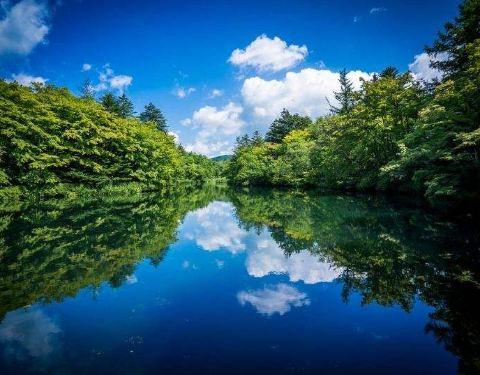 日本长野县的云场池是一座非常平静而美丽的池塘,这里的池水非常的清澈,里面饲养着许多漂亮的锦鲤鱼,而周围则是非常茂密的森林,树林倒影在河水之中,就像是一面镜子,非常的梦幻美丽。
