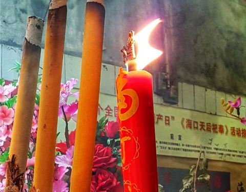在南方沿海一带城市,很多地方都能看到天后宫,这是中华妈祖文化的一个标志。海口骑楼街内的天后宫也是无意经过,就进去看了,入口处不大,但这天非常热闹,好像在做什么祭拜活动,香火很旺,有一个供台上放满了供品,那些供品也很有观赏感的,然后一张桌子上放了很大一口锅,里面是面条,好像是免费供应的,只见有人拿了长筷子在撩面条,我们是过客,无法融入到里面去,也看看热闹了。