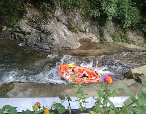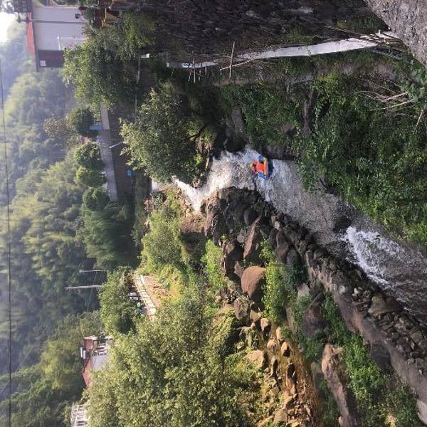 去的那天下了点小雨,山里面空气很清新,上山路有些是钢架搭出来的,下了雨有些湿滑。漂流也很有趣,大概一小时左右,就是有些地方水质不是特别好,可能与那一段两岸都是饭馆有关,有一家饭馆会拿着水管对着你冲,虽然很刺激但冲的我头都晕了,总体来说还行的,带着爸妈一起玩的,挺愉快。