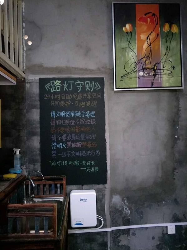路灯计划在沙坡尾艺术西区的一个小角落,算是个意外的惊喜,之前都没有看到过介绍,偶遇的时候眼前一亮。很有创意的共享空间,24小时不停灯不关门,随时可以进去坐坐,喝茶、看书、小憩,舒服的很。简单的小屋被被隔成两层,楼上的沙发可以三五好友小坐,一楼的书桌上有两个留言本,写的满满的,都是来过小屋的人留下的心情。最喜欢的是靠窗的长方形大桌子,上面摆满了茶具,茶叶免费,自己烧水煮茶,和朋友一起品茗畅聊,痛快!