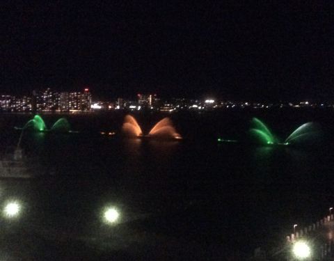 喷泉就在大津港前,每晚大约7点开始。其实有点单调,只有颜色、方向的区别,喷泉形状是不变的,也没配备音乐,看一会就腻了。