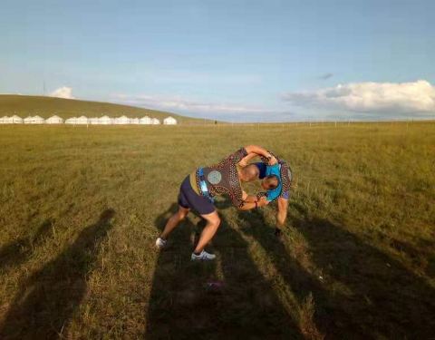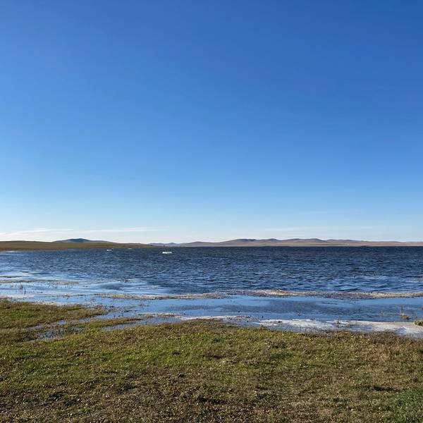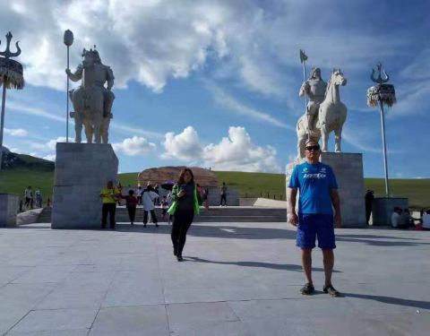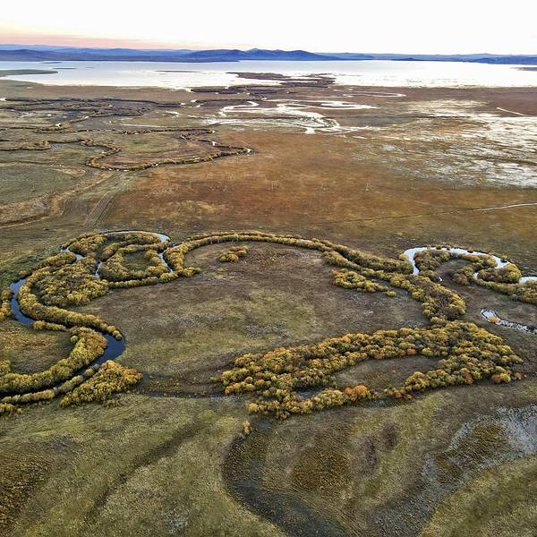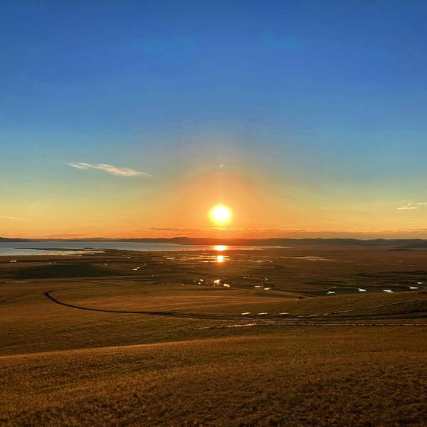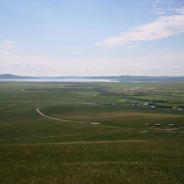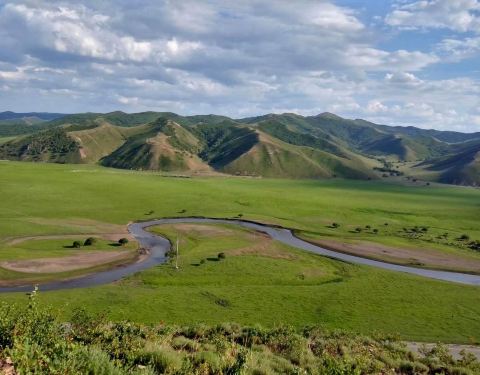 观光电瓶车把我们送到山顶观景台,从台上鸟瞰,乌拉盖河蜿蜒曲折,似一条随风舞动的飘带,镶嵌在绿色的草原上,人称九曲十八弯。河水流经九曲湾后,在湖的东北角注入乌拉盖湖。河边绿草如茵,野花丛生,草原一望无垠,真是一幅绝美的画卷!