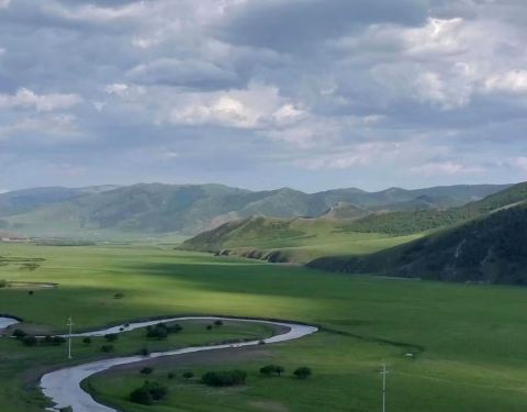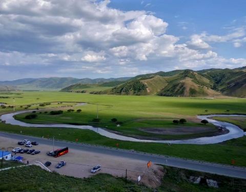 观光电瓶车把我们送到山顶观景台,从台上鸟瞰,乌拉盖河蜿蜒曲折,似一条随风舞动的飘带,镶嵌在绿色的草原上,人称九曲十...沿乌拉盖湖行驶20多分钟,就来到了国家4A级景区——乌拉盖九曲弯旅游区。