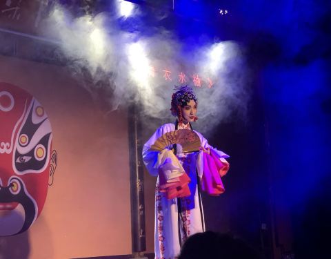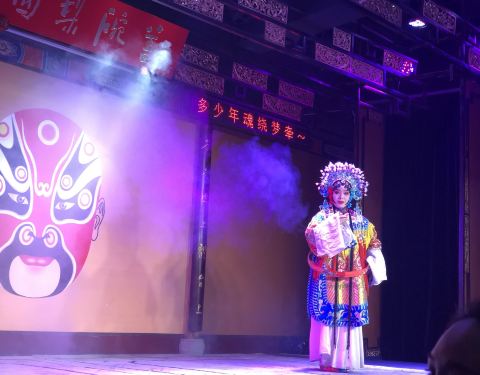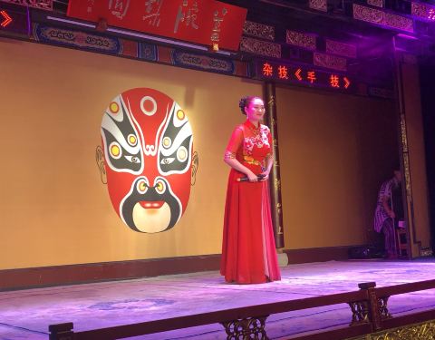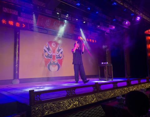 和我当初在西安听秦腔一样,不仅有名段,还有一些别的表演,比如杂技、长嘴壶茶艺表演、手影(这个相当精彩),当然压轴的最著名的变脸表演。虽然看不太懂,但是感觉水平是挺不错的。可以在这里换戏服,然后在演出开始之前去戏台上拍照杂技表演非常精彩的手影表演变脸表演顺便说一下这边的天气,实在是凉爽地有点过头了,最高温度24℃左右,天气阴沉沉的,还有点小风。今天我穿了一条自以为美美的长裙,结果感觉好冷,回来就喝了一支我的旅游神器——藿香正气水,来压压惊。