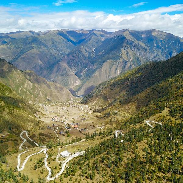弯弯曲曲,一直延伸到山脚高空俯瞰措卡湖