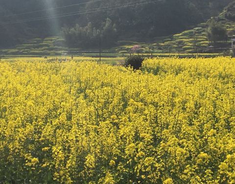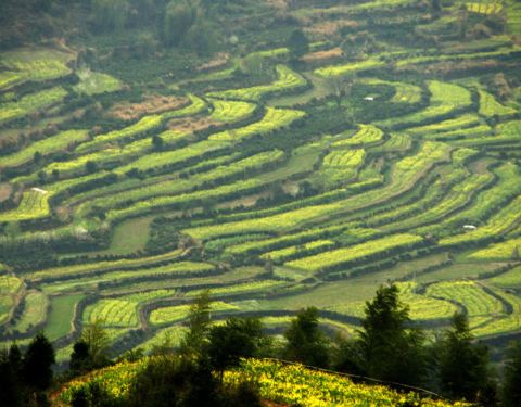 漫山遍野的油菜花呈梯田状,从山顶铺散到山谷下。站在山顶望去,脚下大片的山谷内,油菜花层层叠叠,一望无际,中间围拢着几个小小的村落,黑瓦白墙的徽派民居夹杂在一片金黄之间,在婺源再没有比这更壮观而令人惊喜的了。
