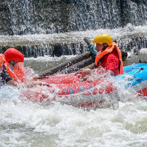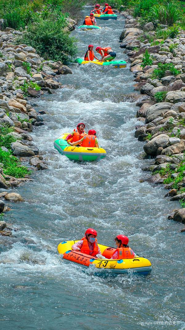 在这个炎炎夏日,在能把皮肤刺破的太阳底下,大概只有清凉的水,才能浇灭那火辣的炎热。在夏天我们最热衷的户外活动是什么?答案:当然是玩水啦!说到玩水就不得不推荐漂流,漂流项目既刺激又好玩。而在 六安 有这样一处世外 桃源 的漂流圣地,但其独特的魅力却吸引着我不远千里前来感受。它就是 六安 金寨 十八盘漂流。这个夏天,让我们一起相约 金寨 十八盘,跟我来一次心灵与碧水的惊险体验!提起 金寨 十八盘漂流,就不得不介绍其独具特色好玩的几个地方。第一:十八盘漂流线全长3.8公里,全程落差高达108米,乘山泉之水,置身青山之间,纵情山水;操桨弄舟,随波逐流,水上漂流时间大概要1.5个小时。第二:漂流所在地就是在杨 柳河 十八盘,沿途奇峰相叠、高低相错的山峦,如旌旗招展,山与水的完美结合是杨 柳河 突出的特色,水绕山行,山临水立,仰角适中,滩潭交错。第三点:山不高,有高山之气魄,水不深,集水景之大成,十八盘每盘自成异境,浅的成滩,深的成潭,沿途有“九滩”“九潭”,两岸山峰竞秀,花木争荣,水碧 山丹 ,风景如画。瞧,映入眼帘是门口的七个大字—— 金寨 十八盘漂流,这是漂流的入口处,两边芳草茵茵,花木峥嵘。尤其是眼前这一片金鸡菊,像极了盛夏的模样,金鸡菊花争奇斗艳,一片连着一片,一朵朵娇嫩的花朵随风舞动、相互映衬,宛如一个个灵动的精灵,美不胜收,惹人陶醉,美丽的田园风光让人不由自主地步入花丛中。欣赏完了金鸡菊花海,我们来到漂流处,听完工作人员的讲解与安全须知,我们领了一个橡皮艇, 穿好了救生衣、戴好了安全帽。一切准备就绪,大伙急不可耐地坐上了漂流皮艇。瞧,这两位可爱的小朋友也准备挑战这项活动,为她们的勇敢点个赞。工作人员开始递给每人一个小划桨。看着湍急的河水顺流而下,看着一个个橡皮艇滑入河流,心里既忐忑又兴奋。水流开始冲刷而下,不一会儿,橡皮艇就蓄势待发,缓缓地滑下去。虽然以前也玩过一些漂流,但每个地方的漂流都是独一无二,尤其 金寨 十八盘漂流更具魅力跟惊险指数。随着第一波水流倾泻而下,我们的漂流旅程开始了!湍急的河流“拼命”地拉着我们向前冲,速度太快,突然溅起了很高的水花,打湿了衣服,我们忍不住大声喊叫。 像皮艇随水流下滑,时不时在水流旁的石壁上相撞,水花四溅,而两旁是茂密丛林和一幅花香鸟语的唯美景象。橡皮艇来到第一个关口,只听“啪”的一声水花四溅,尖叫连连。原来我们的橡皮艇与石壁碰撞,一大波浪花涌进到橡皮艇里,瞬间我们都成了落汤鸡。很快,橡皮艇顺水而下,又来到了一处较为宽敞的地方转了一个弯,我看到阳光突然被头顶的乌云遮挡,四周一下子阴森森的,连水仿佛也冷冰冰的,四处只有我们这一艘皮艇,格外惊险刺激。我们拼命的滑动船桨,去追赶前面的小伙伴。这里很安静,只听到水流哗哗的响声。气氛宁静,可水流却很湍急,一波又一波起伏让前面的橡皮艇一上一下,让坐在橡皮艇里我们也开始提心吊胆。真的是杨 柳河 十八盘,沿途奇峰相叠,嵌空而立,对面就是高低相错的山峦,美如画卷。途中时不时地会经过一些高低不平的大小石坡,一次次地激流勇进,使橡皮艇绝处逢生。这就是漂流的魅力与乐趣,你永远不知道前方等待你的是什么惊险瞬间。突然我们的橡皮艇又撞上了大石头,改变了前进的方向,然后橡皮艇扭向别处,到能通过的地方再继续前进,无论有多少阻碍,橡皮艇都没有要停下来的意思,真是够惊险够刺激。虽然天气有点炎热,但阵阵的微风和秀丽的景色让我们神清气爽。顺着清澈见底的溪水,听着时高时低的水声和蝉的歌声,在这杨柳 河内 ,我们仿佛漂流到了世外 桃源 。突然又到了水流湍急转弯的地方,我沉着地握住船桨,不时船桨插入水底,用力地撑着船桨,控制着橡皮艇的方向,平安地渡过“险区”。此刻橡皮艇飞快地行驶,仿佛在与溪流比赛。我兴奋地呐喊:“这才是真正的漂流!”经历急湍的落差后,我们终于漂到了平缓区,尴尬的是,没有溪流冲击的动力,橡皮艇就踌躇不前,于是我们拿起手中的桨,费了九牛二虎之力,橡皮艇终于往前漂了,此刻我们追上了同行的小伙伴们,于是我们起了偷袭水仗计划。我们把手中的水枪,悄悄的放入 河内 蓄水,伙伴喊了前面的人,突然趁其不备,我们拿起手中的水枪一同朝他们喷射,伙伴索性用帽子泼着水,突如其来的突袭把小伙伴们惊吓到了。二话不说,他们奋起反击,一场不可避免的水仗开始了,真的是既有趣又欢乐。小伙伴加快了划船的速度,在一阵阵的欢笑声中,我们终于湿漉漉的通过了那片“水仗区”,大家都玩的不亦乐乎。往往深厚的 友谊 就是在这样一次次玩耍中,拉近彼此的关系,它是点缀青春圣洁生命的乐曲,是无比美好的青春赞歌。接下来,我们即将挑战垂直高度高达三米多,在落差的峡谷河道的地段,让追求刺激的我们从深水上方一跃而过。这样惊险刺激的感觉非同寻常,经久难忘。一跃而下,从云霄到山谷,短短数秒钟内,又是一次全身湿透透。就这样乘山泉之水,置身青山之间,纵情山水,操桨弄舟,水上漂流,真的是一路感受到河道时宽时窄,水流时急时缓,有激流险滩,又有缓流碧潭。清凉的泉水劈头盖脸地砸到你身上,让人直呼够劲,漂流心驰天更蓝,美景随水推舟船,坐在橡皮艇上四周的美景尽收眼底。过了这一劫,我们悠闲的坐在橡皮艇上,仰望蓝天白云,低头观
