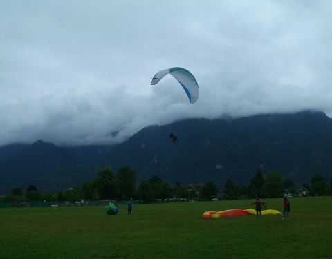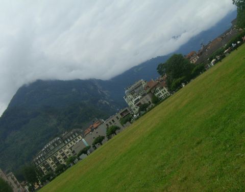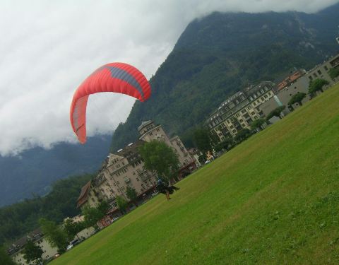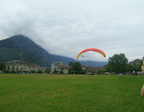我想在因特拉肯高空滑翔一定很美,蓝天白云,远处雪山白雪皑皑,脚下大地绿草如茵,身边云带缠绕。我要飞得更高,一朵色彩鲜艳的伞花从山上起飞,滑过因特拉肯上空,雨后蒸腾的云雾与沿途如画乡村相映生辉,让人陶醉。看到专业选手和业余爱好者的表演,羡慕不已。