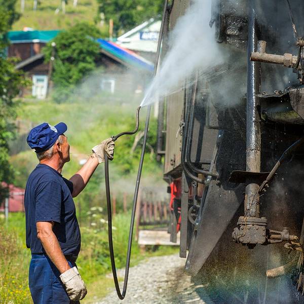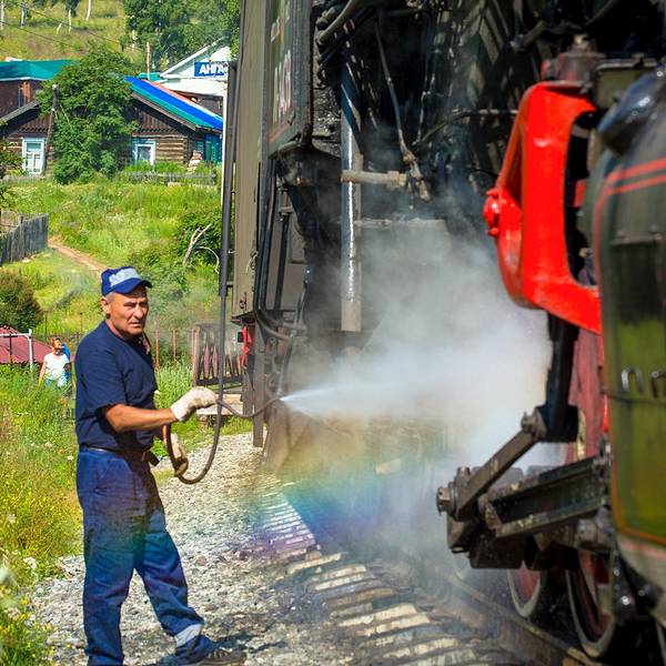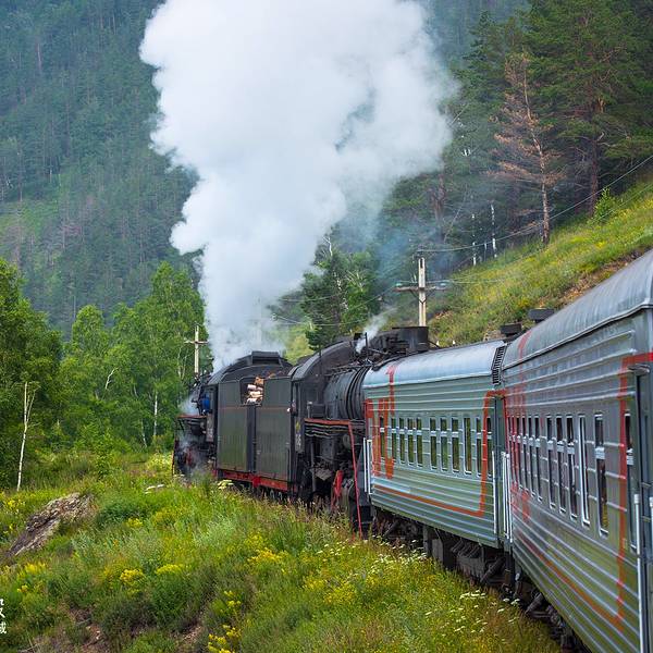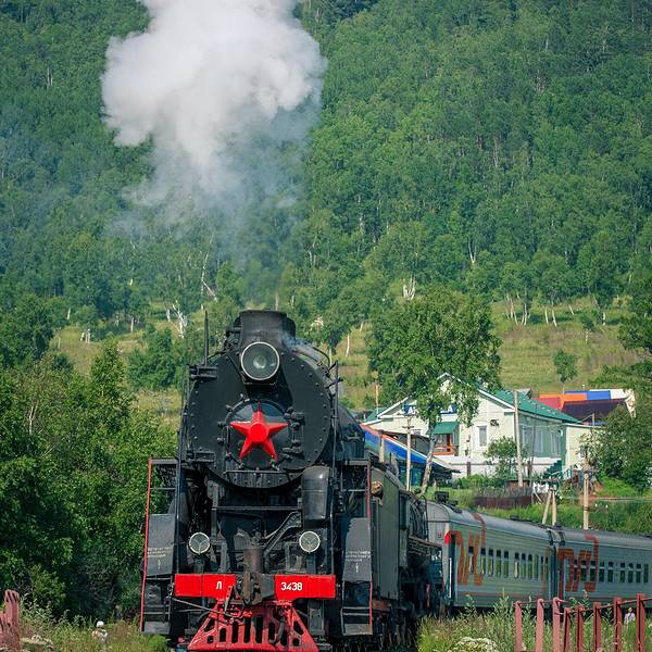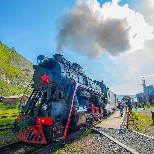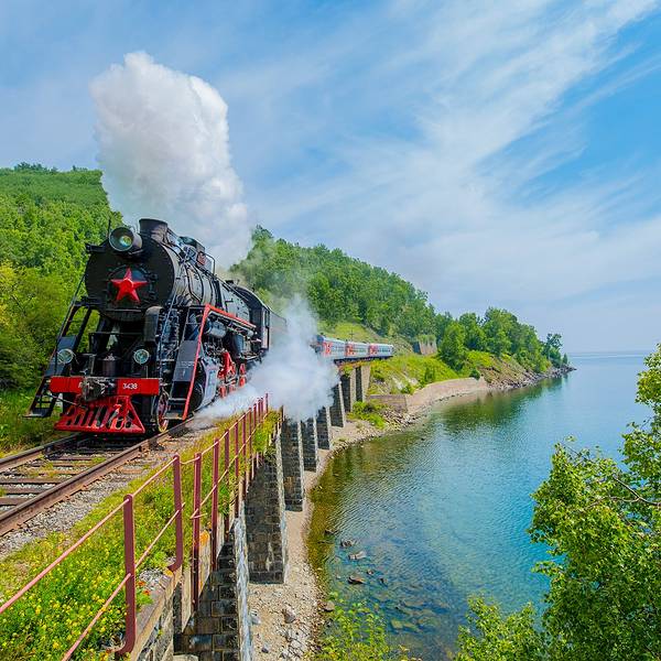 蒸汽列车驶过湖畔的百年老桥坐在慢悠悠的车厢里,听着蒸汽机“库吃库吃”的声音,感受 贝加尔湖 的悠然美丽在贝 加尔 环湖铁路上,运行着一列由 俄罗斯 铁路公司承办的蒸汽旅游火车, 古老的机车吞云吐雾地拖着车厢慢悠悠的行驶在 贝加尔湖 畔。列车夏季每周三、四运行,周三由 伊尔库茨克 站发车,到达 斯柳江卡 站后更换蒸汽机车,然后延环贝 加尔 铁路运行到贝 加尔 港后,转乘坐渡轮到达对岸的 利斯特维扬卡 镇,继续乘坐汽车返回 伊尔库茨克 ,周四的行程亦返。蒸汽火车从 斯柳江卡 运行至贝 加尔 港需要6个小时,会在许多风景好的地方停车供游客下车观赏游玩。列车在开车前会长鸣三声,开车后也会有导游在列车上查人,如果人数不够列车会停下去找。对于铁路爱好者来说,能够体验这样一列古老的蒸汽机车牵引的列车,沿着百年历史的 贝加尔湖 铁路运行,无疑是一段奇妙之旅。