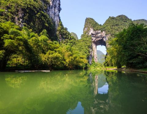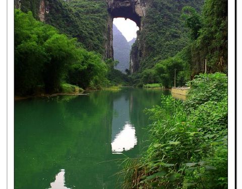 竹篙点水响回音》天工造物天门洞,拱跨蒙河倒影明。水洞幽幽钟乳挂,剑江缓缓洞天行。凉风爽爽穿堂过,薄雾飘飘飞燕鸣。来往竹舟四时荡,竹篙点水响回音。(祖国山水959。蒙河即元蒙河。)
