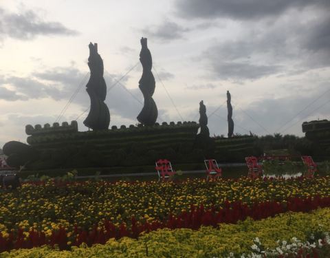 银川绿博园2014.2.28开工,2015.8.31全面竣工,9月第二届中阿博览会期间,2015中国·阿拉伯国家绿化博览会在此盛大开幕。我们在绿博会结束不久来到这里,景色非常美丽。园区很大,可以乘坐电动游览车参观,据说步行全程约20-30公里。我们乘电动游览车入园。园内景致很美,我们去了四季园、约旦园,还有11个城市展园中的西宁园、北京园、沈阳园、常州园、西安园。四季园和园区内鲜花美不胜收。让人觉得百花争艳、五彩缤纷、繁花似锦这类词汇都是为这样的场景准备的,真的是花的海洋啊!