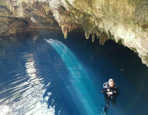 ...然的坑洞泳池,里面的池水非常的清澈,呈现出深邃的蓝色,在这里游泳真的是既奇妙又神秘,非常的舒服