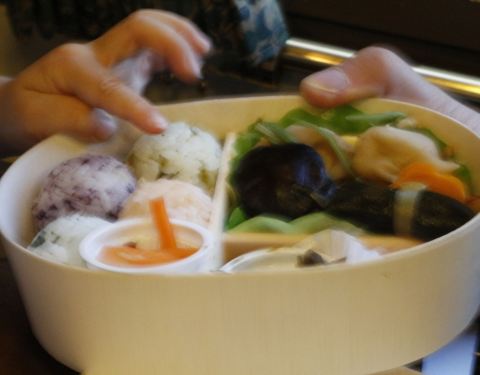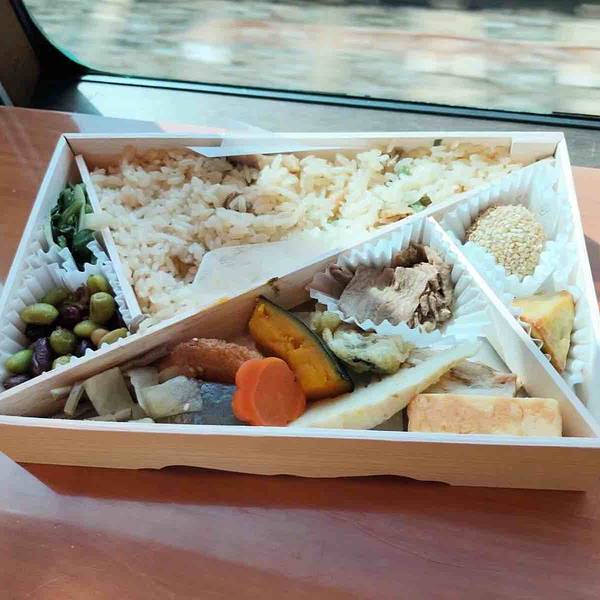 不能错过的还有由布院之森上的美食。便当分三种类型,记得是700、1000和1200日元。当天搭乘时只有1000日元的便当了,加了小银鱼干和豌豆,还淋了酱汁的米饭很美味,小菜品种也很多,有南瓜、玉子、鱼肉、豚肉等等。