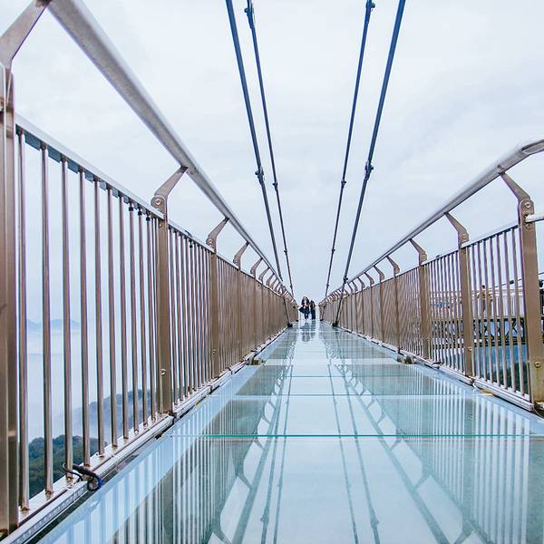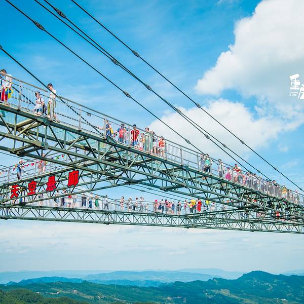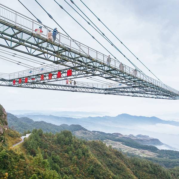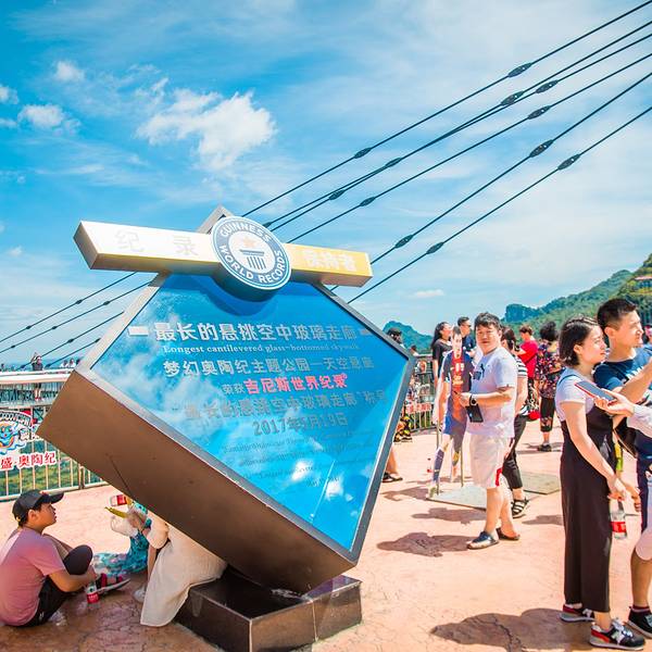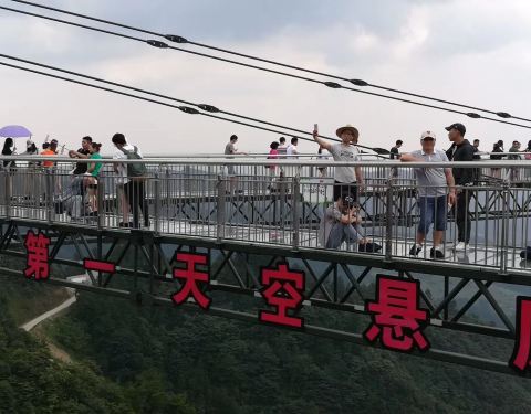 天空悬廊被称为“世界最长的悬挑空中玻璃走廊”。这是世界吉 尼斯 认证的世界最长的玻璃栈道。梦幻奥陶纪这条天空悬廊是以向悬崖外出挑69.6米长度创下的吉 尼斯 世界纪录,它比 美国 著名的 科罗拉多大峡谷 空中玻璃走廊都要长3倍多,是实至名归、当之无愧的“世界第一天空悬廊”。起风的时候,天空悬廊“A”字顶端会随风晃动,行在其间,可以真实感受“人在走,廊在抖”。极目远眺,连绵群山、苍茫大地一览无余,只要一伸手,仿佛就能拥抱整个世界。但是对于有恐高症的游客,那就是一场胆战心惊,如履薄冰的旅途了!但是只要战胜自己内心的恐惧,勇敢走到廊桥的顶端,你会发现那种征服世界的感觉才是奥陶纪想要给你的体验。天空悬廊这是一个钢结构斜拉桥式的建筑,结构十分坚固,安全保障很严格。只是因为是悬空,又是透明的玻璃,看似惊险而已。覆满玻璃的道路让人有一种置身天空之上的视觉效果,无论是晴空万里还是云雾飘渺,都让能让游客流连忘返。 展开
