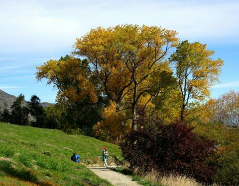 这是皇后镇一条最为经典的徒步路线,整条线路下来大约30多公里,大家都是沿湖边的步道,慢跑或者是骑自行车。这条步道上的景色非常的优美,尤其是在秋天,金黄色的银杏树就像被黄金包裹了一般,真的是超级的漂亮。
