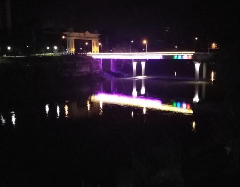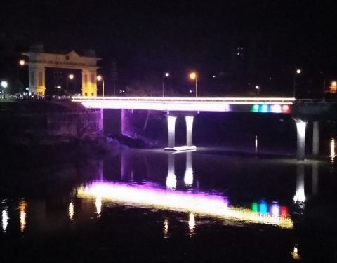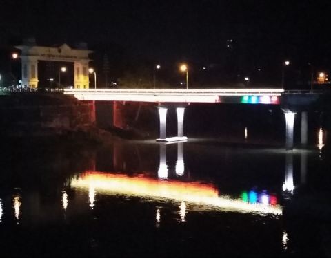 ...间与越南相接处也有漂亮的大桥,大桥在黎明时灯光下也很好看,口岸边上立有界碑,白天人来人往很热闹