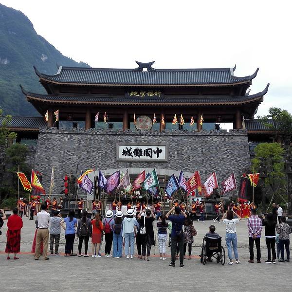 傩城—纯玩的一个景点。虽然说在贵州境内,可离重庆却近在咫尺。它是仡佬族的聚居地,我们感受一下这里的民族风情。两个小时的车程,就到了贵州省仡佬族的集居地—傩城。虽然不收费,可欢迎仪式做足了全套入城先...