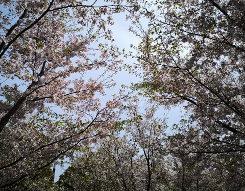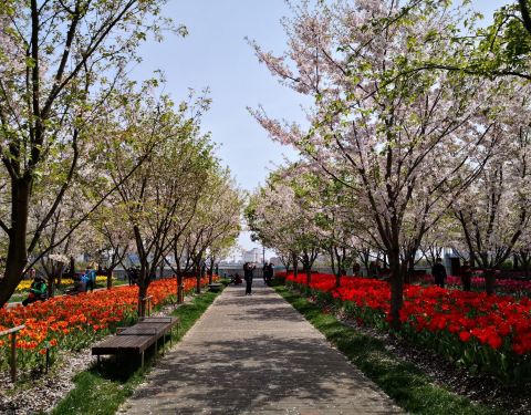 黄浦江边的琴键春园,这里种植了大片的染井吉野樱,有几株大树植在一起,立于树下,抬头仰望,再有一阵风吹过,无数的花瓣,纷纷而落,说不出的唯美,浪漫。放眼望去,上层樱花成云,下层郁金香遍地,绽放的鲜花形成了一道道条状色块,与休闲步道间隔,形似钢琴键盘。穿行在滨江绿道上,一边是无敌江景,另一边是繁花春色。