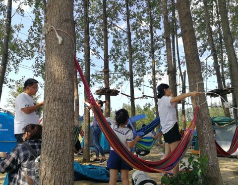 浦口区,比珍珠泉还要远一点。基本上都是自驾来这里,因为有自己的停车场,停车免费。 说是老山脚下,树木其实不多,两片小树林挤满了寻找绿荫的人,下面是帐篷和垫子,中间是吊床,上面是林中漫步。 吃饭的农家...