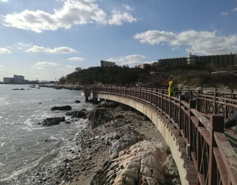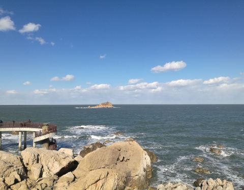 在山东省烟台市也有一处獐岛,该岛位于牟平区养马岛的东南角,是一组突出海面的礁石群,这里怪石林立,很有原始海岸的味道。栈桥颜色与环境很协调。