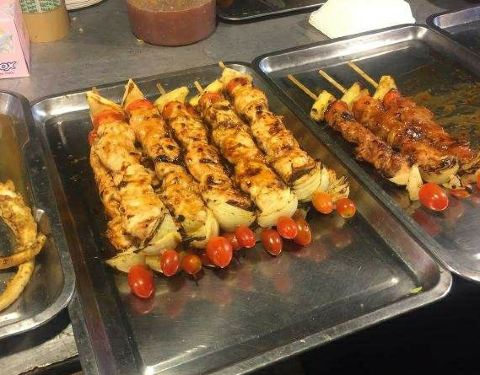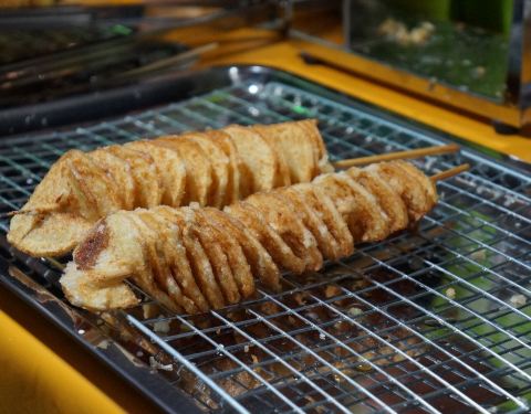 饭后慢慢游走经过的夜市,这里有很多特色的泰国小吃购买。有很多吸引的肉串,但洋葱和肉串混合在一起,洋葱很容易会烧糊,而且也不喜欢吃洋葱的味道,比较喜欢纯肉串的。烤椰子薄饼,看上去挺吸引的,现场制作,一块块小小的圆形薄饼,在上面铺了cream,卷在一起,但吃了一口发现超级甜,不太符合我的口味。
