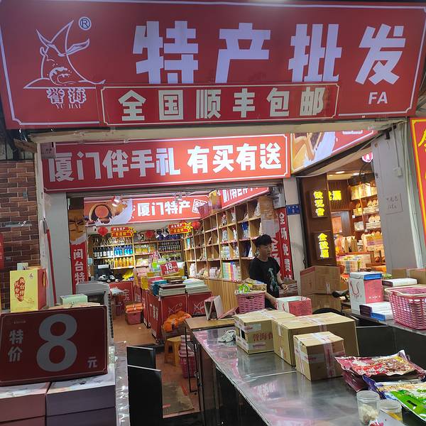 八市里面有一家誉特产,超级便宜,在市区要卖28的特产,这里只需要8元(可惜我已经在双子塔附近买完了),问了下,誉海是连锁,这个是厂家,所所以特别便宜。推荐给大家八市夜晚很热闹据说阿吉仔也是卖特产特别好的店,不过没有开八市入口