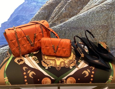 2020是Versace经典丛林印花系列20周年,为了表示庆祝,Versace在2020春夏季的设计中,以热带的绿和夺目的橙色为重点,就连一双小白鞋也画龙点睛的加上了有“V”字图案的橙色丛林印花图腾 ; 手袋上,是铆钉排列组成的丛林中繁复的树叶。