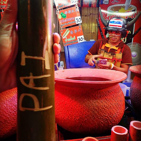 晚上在拜县夜市附近的餐厅吃完晚餐顺便可以逛逛拜县夜市。拜县很小,所以夜市也不大,镇里的两条主要街道就成了夜市,虽然没有清迈的周末夜市那么繁华热闹,但也是可以走走,体验一下不同地方夜市的特点。夜市里挺多小吃的,感觉比清迈周六夜市的吸引多了。夜市的草莓,这里才10B已经有一大袋。鲜烤鱿鱼,价格也比曼谷的便宜多,一定要尝尝。烤鱿鱼干,挑选了一根,在火炭上烤, 烤干后再用仪器再压扁。烤出来的鱿鱼很干,咸味不够。泰式姜茶,姜味不够辣。