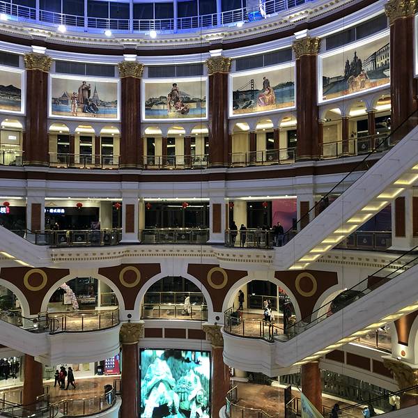 江南环球港和上海环球港的内部装修风格是一样的,有点宫廷版的感觉,不过感觉江南环球港玩的东西比较多,顶层都是玩的,还有一个摩天轮,商场内的购物店和美食店的数量也挺多的,离高速口也非常近,值得去逛逛。