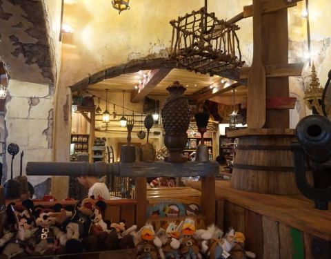 加勒比海盗沉落宝藏之战出来后,就直通到达布隆集市了。这里就是售卖各种海盗必需品了。 海盗的衣服、帽子、刀具等,各种配件应有尽有。有海盗情结的话,真是跌进米缸了。 木质结构的屋顶货架、斑驳的墙面、粗绳...