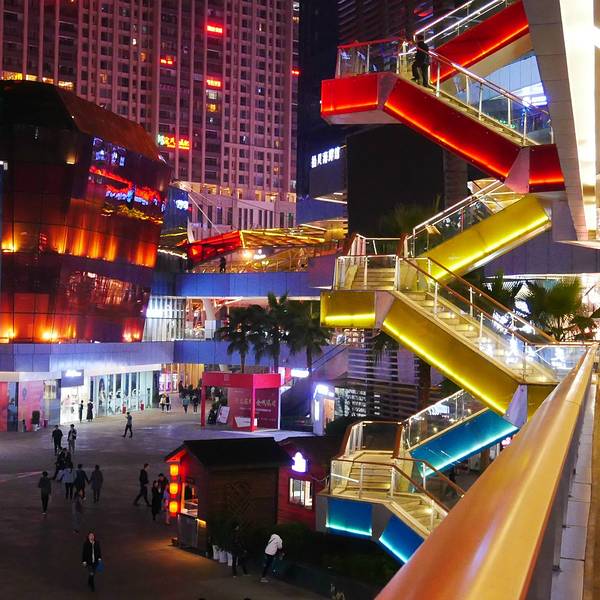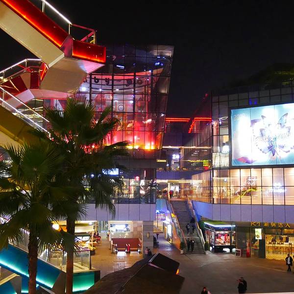 花果园购物中心作为市区的地标建筑物,造型非常别致,形同一颗被切割开的宝石,从内部散发出多彩的光芒