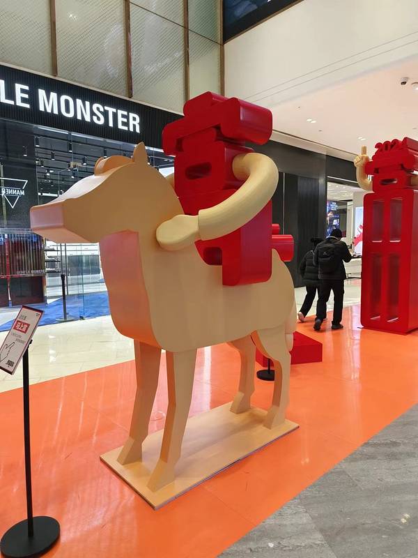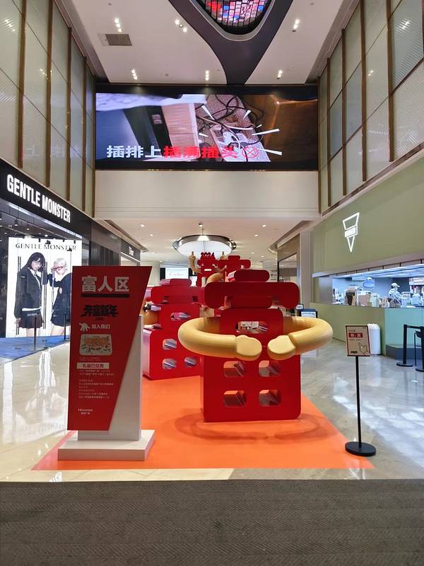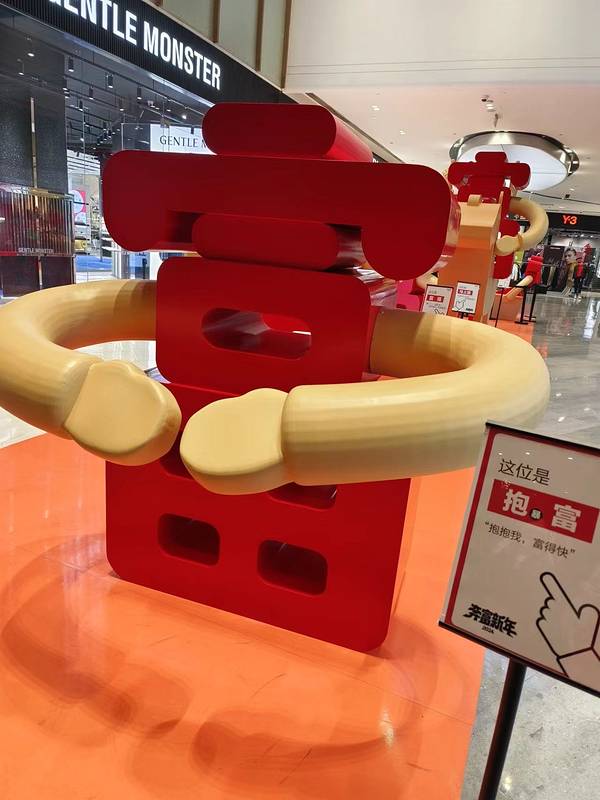 进商场到没有什么想逛的店,只是去江边恰好顺路,从里面走比较暖和。 我们只在一楼穿过海信广场,在正门前看到了新年“暴富”的装饰。一边猜谜一边就拍了照片。 毕竟上传的照片是压缩过的,拍的字基本看不清。不妨看备注之前一起猜猜看,这个雕塑想说什么。刚进门就步入“富人区”,这个装饰还挺有意思的谜底:一直富谜底:抱富谜底:马上富