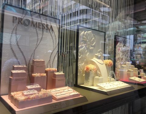 在德福广场二期通向一期的走道处就有周生生、周大福、六福珠宝、金至尊等等,可以说买金的话,真的不用去弥敦道了,在德福广场这边就能够有很好的选择。周生生的婚戒可以自选钻石的品质以及大小、钻托、指环的材质以及刻上名字,制定为新人独特的一对钻戒。